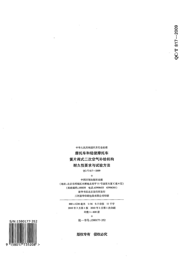 《摩托車和輕便摩托車簧片式二次空氣補(bǔ)給機(jī)構(gòu)耐久性要求與實驗方法》QCT817-2009